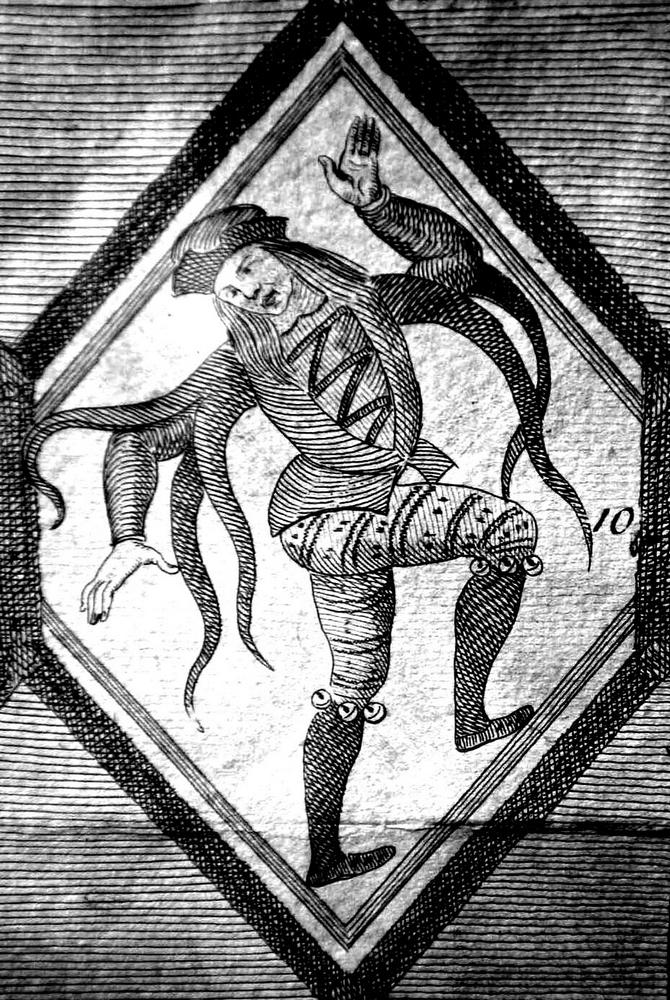 The Betley Window stained glass panel, detail of a dancer. Clear glass painted with coloured enamels & yellow paint. England, 1621.