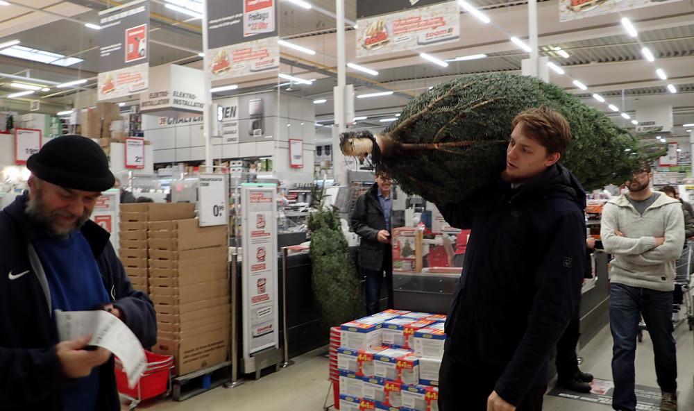 Choosing a Christmas tree at Toons - Jan carrying
